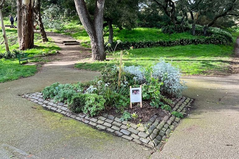 After Russell's death in 2018 at age 86, four of her friends decided to carry on her work, forming a volunteer group that has since expanded the garden along Stanyan Street with native California plants including salvia, buckwheat, evening primrose, and red flowering currant. The group meets the first Saturday of each month from 10am to noon, and all are welcome to join. A dedicated park bench with a plaque reading "She shared beauty and kindness with all who entered here" honors Russell's memory and has become a stop on geocaching scavenger hunts. Kathleen's Corner serves as a beautiful reminder that small acts of stewardship can transform not just a patch of earth, but the entire spirit of a place.