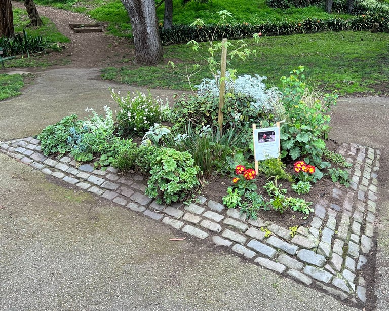 After Kathleen's passing in 2018 at age 86, some of her friends decided to carry on her work, forming a volunteer group that has since expanded the garden along Stanyan Street with native California plants including salvia, buckwheat, evening primrose, and red flowering currant. The group meets the first Saturday of each month from 10am to noon, and all are welcome to join. A dedicated park bench with a plaque reading "She shared beauty and kindness with all who entered here" honors Kathleen's memory and has become a stop on geocaching scavenger hunts. Kathleen's Garden serves as a beautiful reminder that small acts of stewardship can transform not just a patch of earth, but the entire spirit of a place.